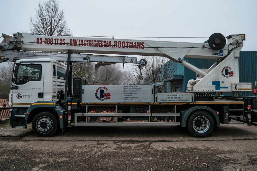 De vloot van Dak- en gevelwerken Dirk Roothans heeft er een grote broer bij. Onze nieuwe Böcker kraan/hoogwerker kan maar liefst 37 meter hoog reiken én hij is mobiel want hij staat gemonteerd op een stevig MAN vrachtwagenchassis.